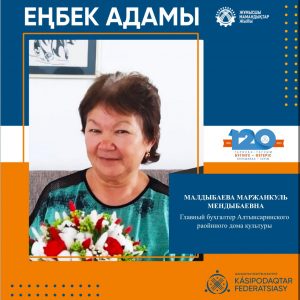 Главный бухгалтер Алтынсаринского районного дома культуры Маржанкуль Мендыбаевна Малдыбаева — человек, который нашёл своё призвание и остаётся ему верен многие годы. За её плечами 45 лет трудового стажа, из них 20 — в текущей организации. Она в совершенстве владеет бухгалтерским делом, чётко знает свои обязанности и обеспечивает стабильную, качественную работу бухгалтерии. Спокойствие, доброжелательность и уважительное отношение к людям стали её визитной карточкой.