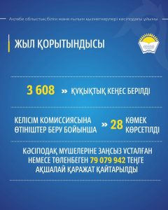 Құқықтық қолдау бағыты бойынша 2025 жылы 3608 құқықтық кеңес берілді. Келісу комиссияларына жүгіну көрсеткіші артып, нәтижесінде кәсіподақ мүшелеріне 79 миллион теңгеден астам заңсыз ұсталған немесе төленбеген қаражат қайтарылды.